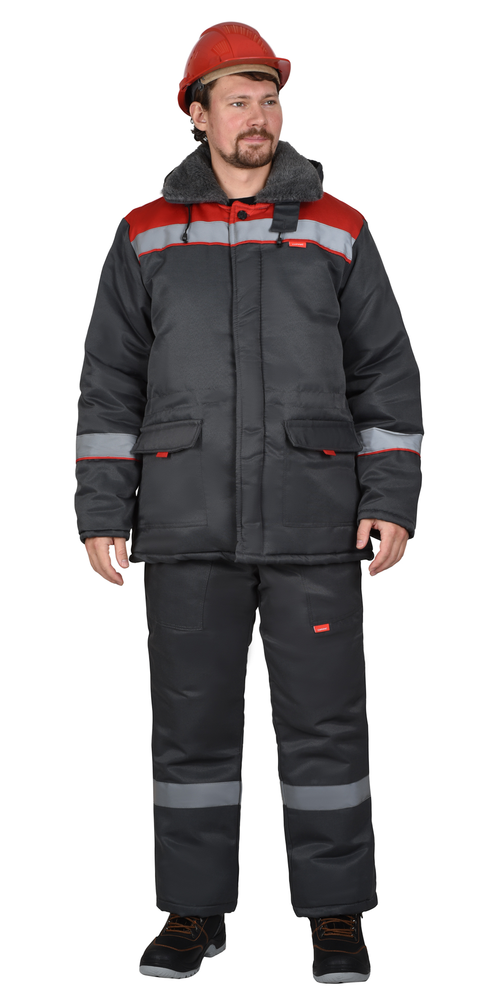 - 139205 Куртка "БРИГАДИР" мужская с мех. ворот. т-серая с красным и СОП (ЧЗ) тк. Гретта